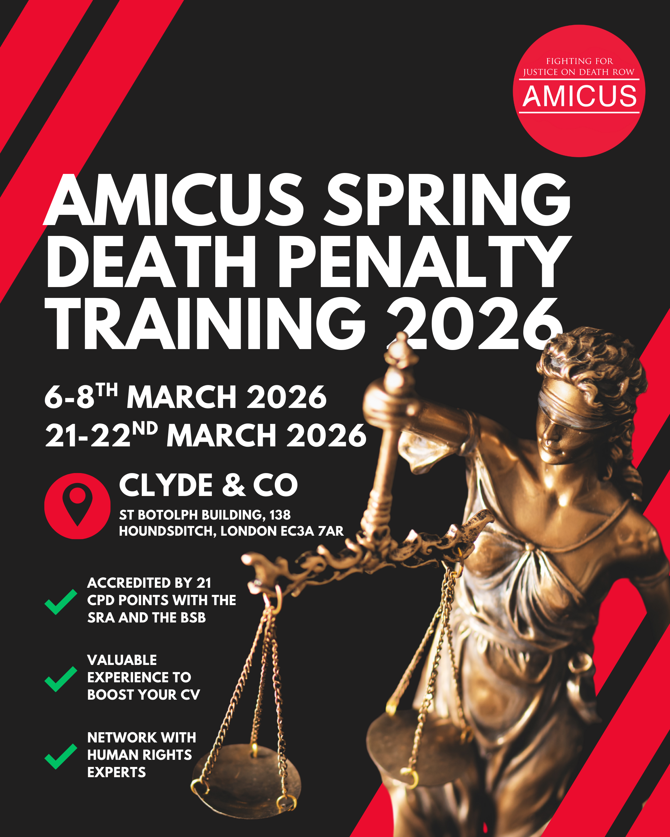 Amicus runs a comprehensive bi-annual training programme in US capital defence law and procedure, legal research, evidence, and professional conduct. Training is encouraged for all our volunteers and is compulsory for anyone wanting to undertake the Amicus US Placement.
